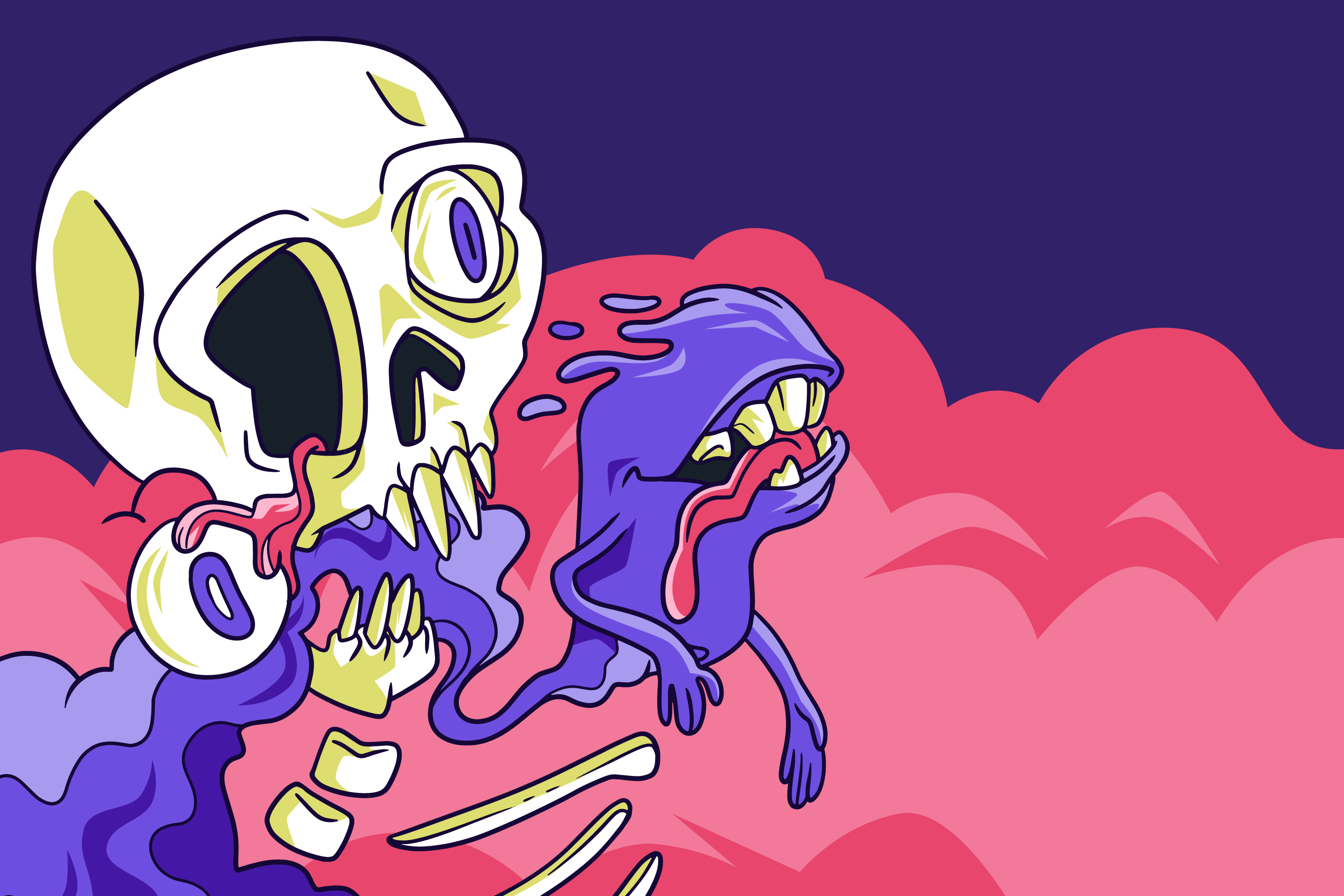 A psychedelic skull study exploring the tension between playfulness and decay. Bold candy tones, liquid forms, and crisp vectors bring a surreal, pop-art mood meant for covers and prints.
