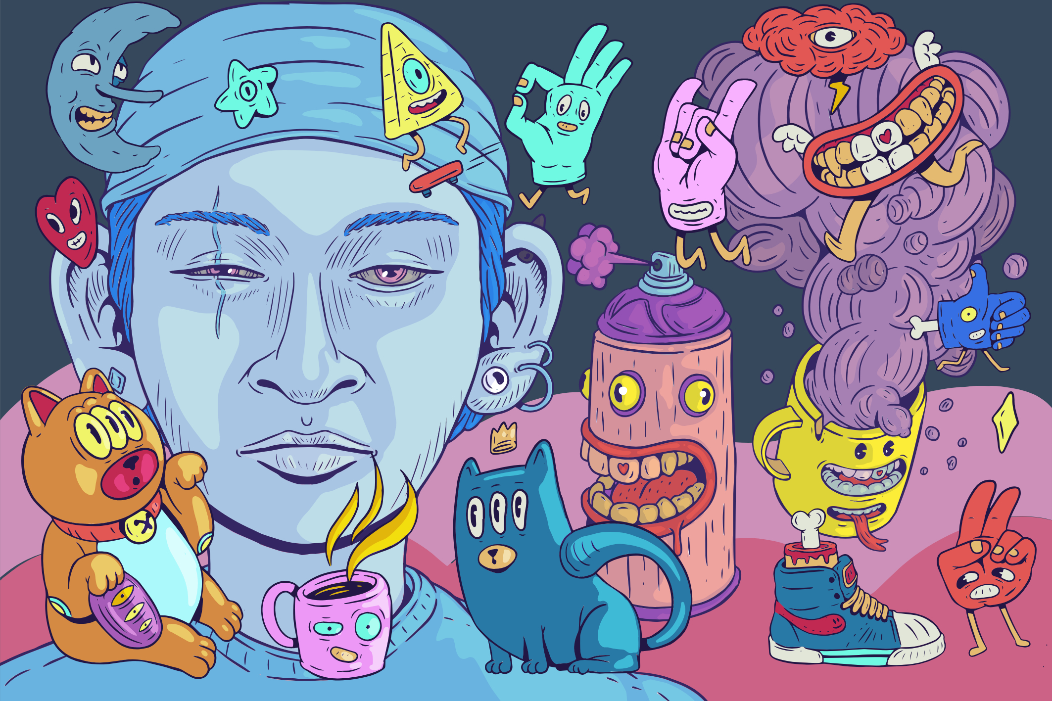 A playful portrait surrounded by oddball companions—mascots, monsters, and midnight snacks. Loose linework meets pastel whimsy, perfect for merch, stickers, and editorial spots.